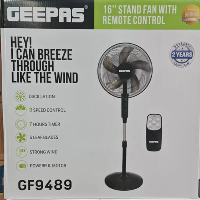 برند جیپاس GEEPAS یکی از عرضه کنندگان لوازم خانگی و برقی است که با بیش از 36 سال تجربه ، در اغلب قاره ها اعم از آسیا و اروپا و آمریکا از استقبال بسیار خوبی برخوردار بوده است.پنکه ایستاده جیپاس مدل GF9489N از انواع پنکه های ایستاده این شرکت است که کیفیت بسیار مناسبی دارد .از مزایای این پنکه دارا بودن حالت های متنوع عملکرد می باشد که مناسب برای زمان استراحت و در شب و یا در شرایط عادی بوده و با فشردن دکمه MODE با قراردادن در وضعیت استراحت در شب ، پنکه بطور خودکار، تغییراتی متناوب در سرعت ایجاد می کند یعنی در مدت چند ثانیه با سرعت بالا کار می کند و بعد از آن برای چند ثانیه سرعت بسیار کاهش پیدا می کند و این عملکرد بطور مکرر انجام می شود که سبب افزایش کیفیت خواب کاربر می شود . این دستگاه پنکه از تایمر با زمان بندی 0.5 تا 7.5 ساعت بهره می برد که نحوه تنظیم آن بسیار مبتکرانه از سوی تولید کننده طراحی شده است با یک بار فشردن دکمه تایمر LED مربوط به نیم ساعت روشن می شود و با فشردن بار دوم این زمان بعلاوه نیم ساعت شده و چراغ 1 ساعت روشن می شود و در فشردن برای سومین بار چراغ 1 ساعت و نیم ساعت روشن می شود و تایم روی 1.5 ساعت قرار می گیرد و به همین ترتیب تا 7.5 ساعت با فواصل نیم ساعته قابل تنظیم است.کلیه کارکردهای پنکه با ریموت آن قابل کنترل است . میله وسط از جنس استیل بوده و از استحکام بالایی برخوردار است و باعث می شود ارتفاع پنکه را بتوان با یک پیچ در پشت آن به 133 سانتیمتر رساند .
