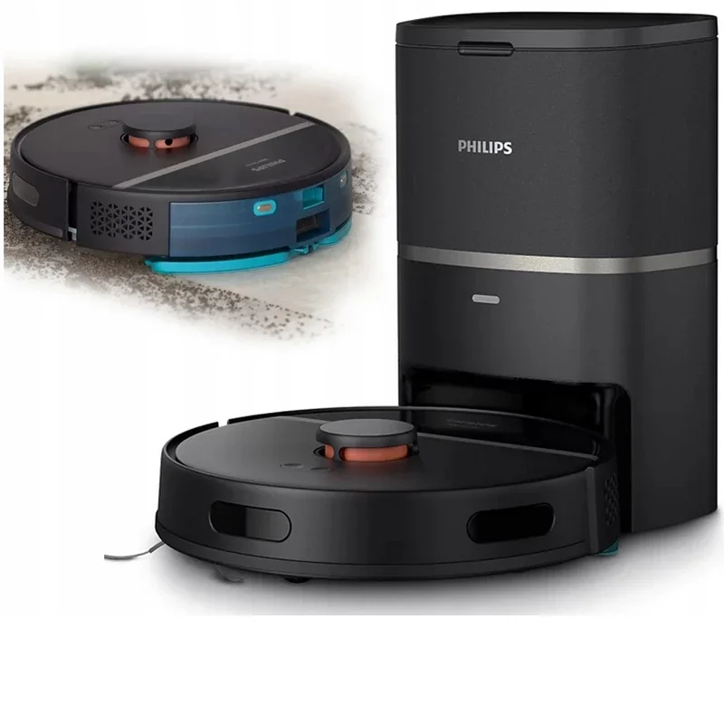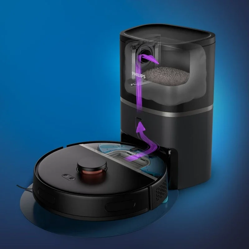 جارو هوشمند رباتیک فیلیپس، قدرت مکش فوق العاده قوی تا ۴۰۰۰ پاسکال میتواند کثیفی های بزرگی مانند خرده ها را جمع میکند، ربات بطور خودکار قدرت مکش را روی فرش و قالیچه افزایش میدهد تا گرد و غبار ریز را از اعماق فرش و جارو خارج کند، ناوبری لیزری ۳۶۰ درجه که خانه را اسکن میکند و به کارآمدترین مسیر از اتاقی به اتاق دیگر ،اطراف مبلمان، و در اعماق گوشه ها کمک میکند بنابراین هیچ منطقه ای خارج از دسترس نمیماند، ارتفاع ربات ۹۶ میلیمتر میباشد که براحتی زیر تخت و مبلمان را نیز تمیز میکند، باتری قدرتمند لیتیوم ۴۸۰۰ میلی آمپری که به شما این امکان را میدهد تا با یک بار شارژ کامل تا ۲۰۰ دقیقه یا بیش از ۱۸۵ متر مربع را تمیز کنید، در صورتیکه شارژ ربات در حین تمیز کاری تمام شود ربات به طور خودکار به ایستگاه باز میگردد تا دوباره شارژ شود و سپس تمیز کردن را از جایی که متوقف شده است شروع میکند، قدرت مکش ربات در چهار حالت ماکسیمم توان، حالت اکو، نرمال، و زیاد قابل تنظیم میباشد، دارای پد نانو که گرد و خاک سطوح را تمیز میکند و حتی اگر پابرهنه راه بروید دیگر کف پای شما تمیز میماند، قابلیت اتصال بوسیله وای فای به تلفن های هوشمند، یکی از برترین ویژگی های این محصول این میباشد که بعد از اتمام کار دستگاه بصورت خودکار گرد و خاک از دستگاه ربات خارج و در کیسه یکبار مصرف جمع میشود و دیگر شما گرد و خاکی بابت تخلیه مخزن دستگاه نخواهید داشت همچنین پاکت این جارو از سری S bage میباشد که همه جا در دسترس میباشد و نگرانی از بابت پاکت نخواهید داشت.