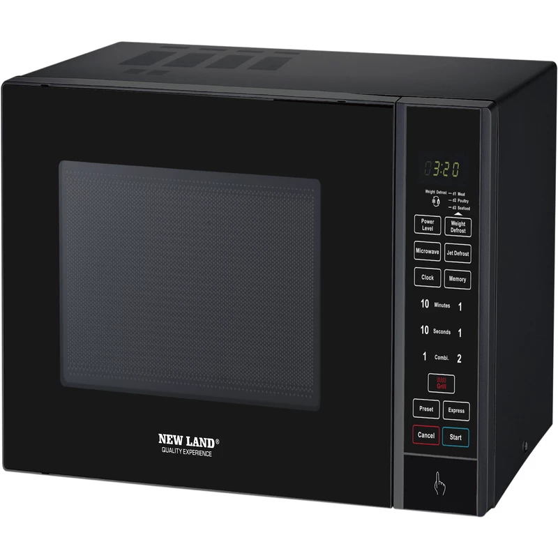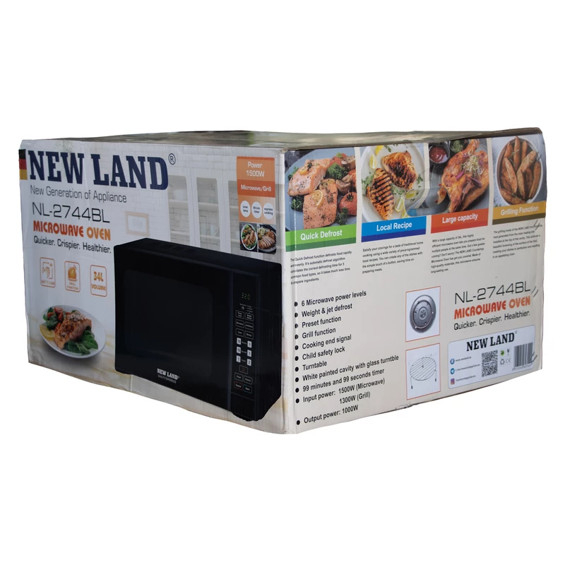 مایکروویو نیولند (Microwave oven) مدل: NL-2744-BL ؛ این محصول با توان مصرفی 1500 وات و گنجایش 34 لیتر دارای 6 سطح قدرت و دارای جت یخ زدا می باشد . از دیگر ویژگی های این محصول می توان به عملکرد از پیش تعیین شده و عملکرد گریل سیگنال پایان پخت و پز و قفل ایمنی کودک اشاره کرد . این محصول دارای صفحه گردان شیشه ای و دارای تایمر 99 دقیقه و 99 ثانیه ای می باشد و همچنین دارای توری سه پایه می باشد. با مایکروویو نیولند،آرامش را زینت بخش منزل خود کنید.