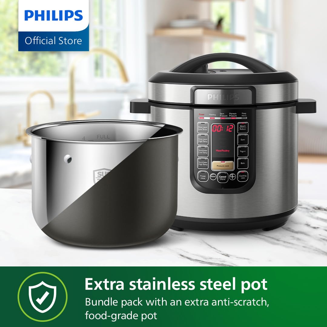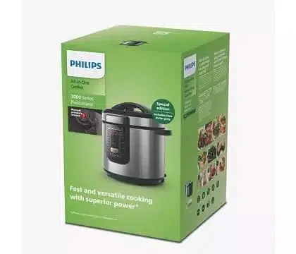 اگر به اصلیترین ویژگی مولتی کوکر فیلیپس اشاره کنیم، بیشک طراحی جذاب آن میباشد. بدنه این دستگاه از جنس استیل ضد زنگ و بسیار مقاوم ساخته شده است که در برابر هر ضربهای محکم بوده و تحمل هر گونه فشار و دما را دارد. ظرف داخلی این مولتی کوکر از جنس آلیاژ آلومینیوم با دوام ساخته شده است که گرما را به بهترین شکل ممکن پخش میکند. روکش دیگ این دستگاه به صورت ضد خراش و نچسب ساخته شده است که علاوه بر عدم چسبندگی مواد غذایی، شستشوی دستگاه را نیز آسان میکند. همچنین درب داخلی مولتی کوکر برند فیلیپس به راحتی جدا میشود و قابل شستشو است.