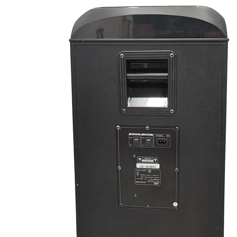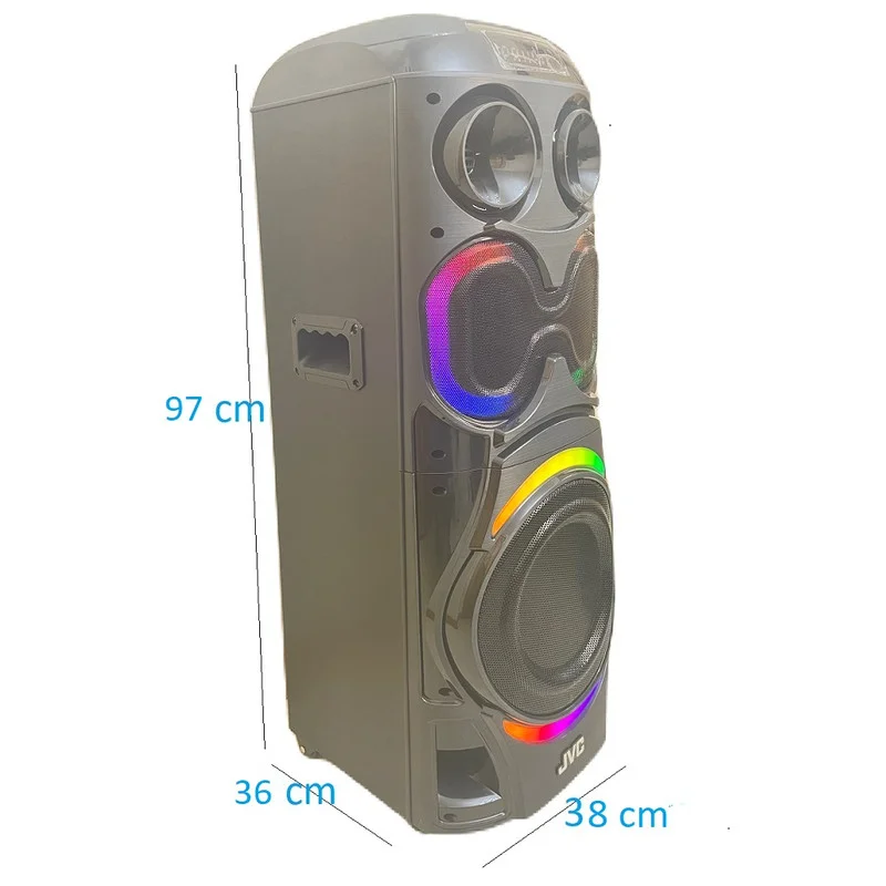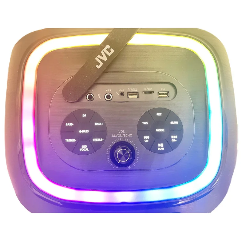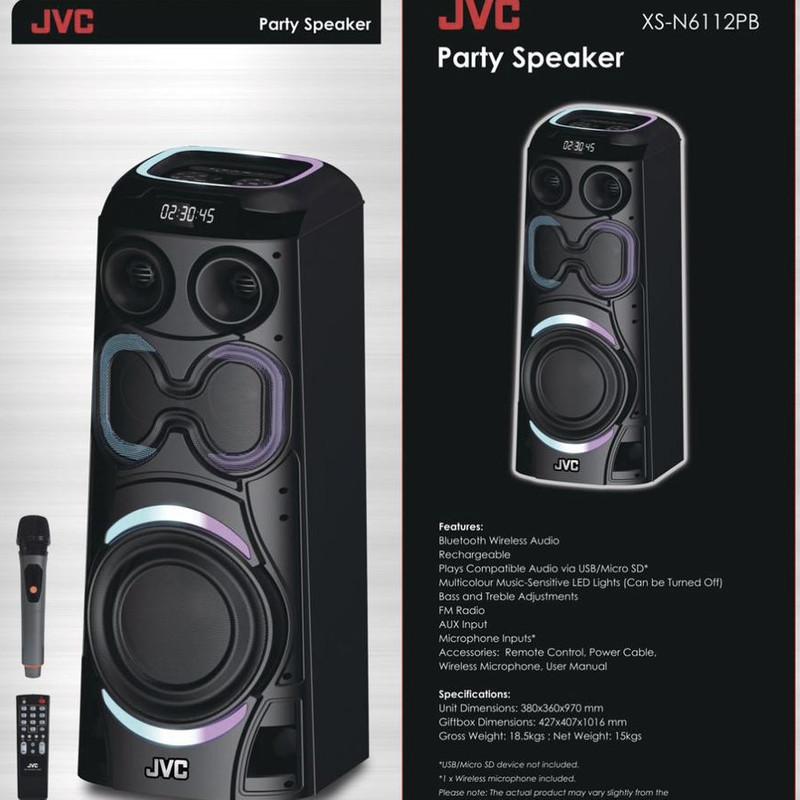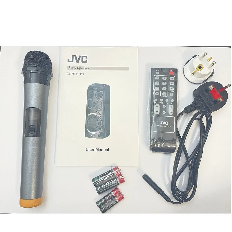 جی وی سی(JVC) شرکت ژاپنی می باشد که در سال 1927 (حدود 100سال) تاسیس شد و با تولید تلویزیون و دستگاه های VHS به برند جهانی و شناخته شده تبدیل گردید.هم اکنون محصولات این شرکت در چین و مالزی و تحت لیسانس خود شرکت جی وی سی و با کیفیت اصلی تولید می گردد. اسپیکر بولوتوثی پارتی باکس قابل شارژ مدل XS-N6112PB از محصولات جدید و بروز شرکت جی وی سی می باشد که در سایز بزرگ( ارتفاع 100 سانتی متر) برای مهمانی های بزرگ طراحی شده می باشد. در زیر این اسپیکر دو چرخ تعبیه شده می باشد که باتوجه به سنگین و بزرگ بودن اسپیکر جابه جایی آن را تسهیل می نماید.این اسپیکر دارای توان 2400 واتP.M.P.O (120 وات واقعی خروجی)که صدای بسیار بالا و باکیفیت مناسب تمام فضاها از جمله فضاهای باز و بزرگ تولید می کند.همچنین دارای دکمه G-Bass می باشد که با فشردن این دکمه باس و حجم صدا را چند برابر می کند.این دستگاه دارای سیستم TWS می باشد به این صورت که با خرید دو دستگاه از این مدل اسپیکر و قرار دادن در حالت بلوتوث و فشردن این دکمه بصورت همزمان دو دستگاه را به یکدیگر از طریق بلوتوث متصل می نماید و صدای مناسب مجالس و مهمانی های بزرگ از طریق دو اسپیکر ایجاد می نماید.این دستگاه دارای دو ورودی میکروفن،1 عدد میکروفن وایرلس،1 عدد ورودی AUX،ورودی flash USB (فلش های دارای ظرفیت حداکثر32 گیگابایت و فایل های mp3 را ساپورت می کند)،1عدد درگاه card TF- micro SD،درگاه شارژ USB وسایل الکترونیکی موبایل،تبلت و غیره می باشد. رقص نور LED دستگاه دارای تنوع می باشد که با فشردن کلیدLED Vocal حالت های رقص نور را تعویض می کند.همچنین دکمه Bass,Trebleجهت تنظیم باس و تربل موسیقی از مثبت تا منفی قابل تنظیم می باشند.دکمه REC این دستگاه قابلیت ضبط موسیقی همراه با خواننده(هنگام اجرا توسط میکروفن وایرلس یا میکروفن های باسیم که به دستگاه متصل می شوند) بر روی فلش USB فراهم می نماید به این صورت که با فشردن و نگه داشتن چند ثانیه دکمه REC شروع به ضبط صداها همراه با صدای موسیقی در حال پخش از دستگاه می نماید و بافشردن مجدد این دکمه قطع می نمایدو برای پخش یک بار دکمه REC را باید فشرد. همچنین این دستگاه دارای دکمهDJ می باشد که 4 مدل صدای از پیش تعریف شده را با هر بار فشردن این دکمه وسط موسیقی در حال اجرا ،پخش می نماید.ا