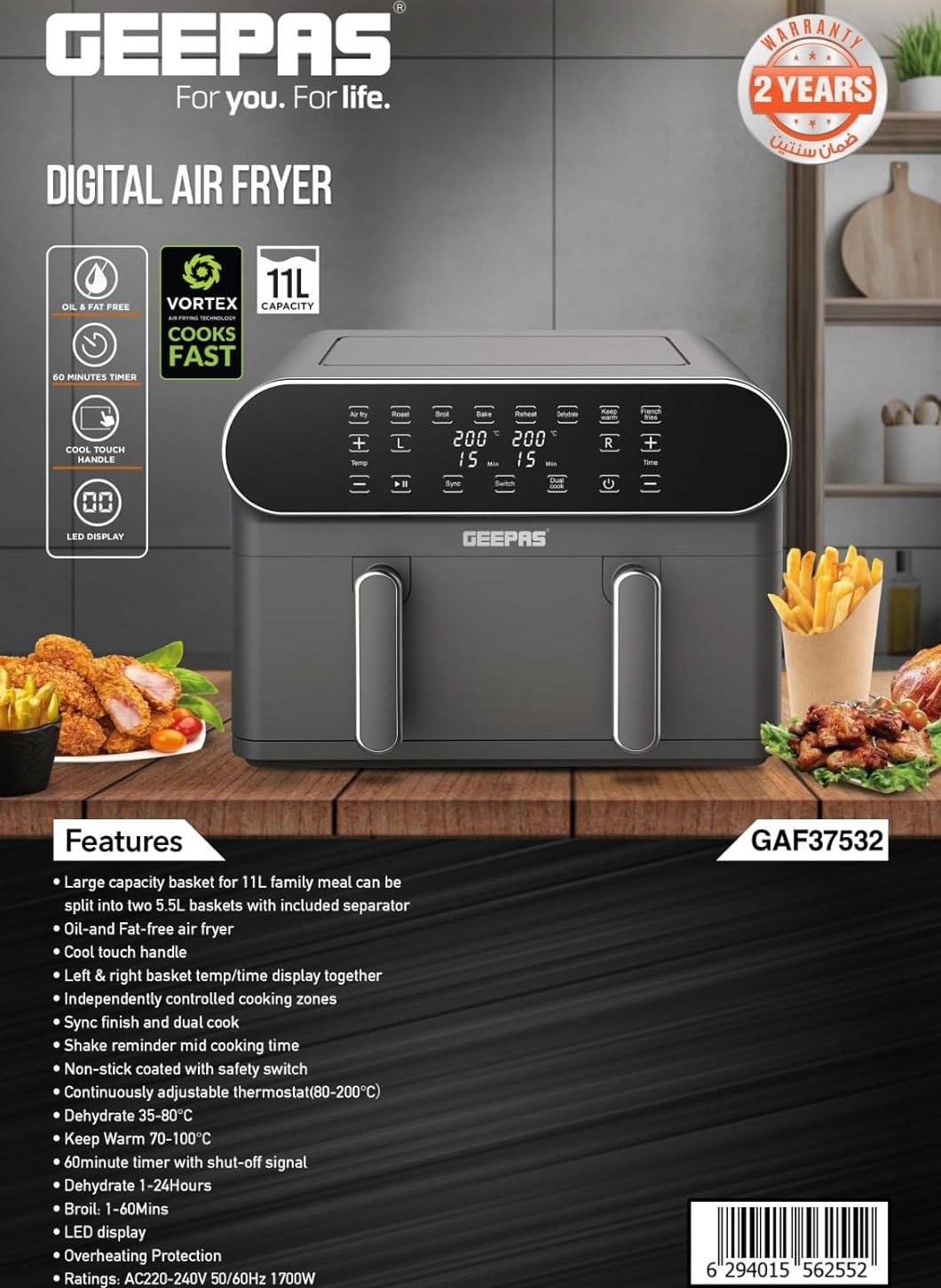 سرخ کن دوقلو جیپاس مدل GAF37532، یکی از بهترین مدل سرخ کن بدون روغن موجود در بازار است که با طراحی مدرن و عملکرد عالی، امکان پخت و پز غذاهای خوشمزه و سالم را بدون نیاز به روغن فراهم میکند. این دستگاه با ظرفیت 11 لیتر، مناسب برای خانوادهها و مهمانیها بوده و با دو سبد مجزا، امکان پخت دو نوع غذا به طور همزمان را فراهم میآورد. با پنل کنترل لمسی دیجیتال و 10 برنامه پخت متنوع، کاربری آسانی دارد و میتواند انواع غذاها را با تنظیمات مختلف دما و زمان به صورت سالم و بدون نیاز به روغن آماده کند.