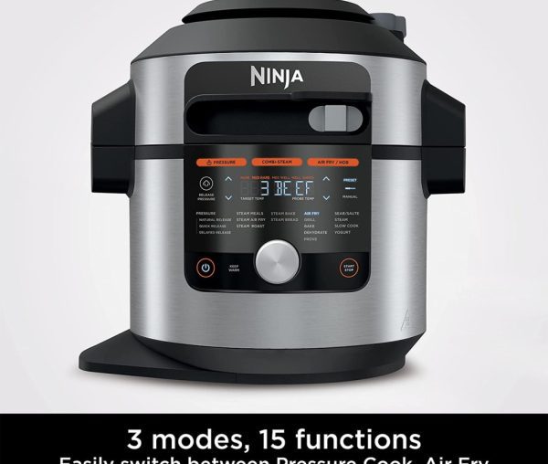 از سازندگان مولتی کوکر Ninja Foodi که بازی را تغییر می دهد، این مولتی کوکر نسل بعدی راه های هیجان انگیز تری را برای طبخ غذاهای مورد علاقه شما ارائه می دهد – از جمله حالت مبتکرانه Combi-Steam برای نتایج شاداب، سریع و ترد! با این مدل 7.5 لیتری با ظرفیت بزرگ، زمان غذا را به MAX ببرید، که برای پخت و پز تا 6 وعده عالی است. 3 حالت، 15 عملکرد: 15 عملکرد پخت و پز را در زیر یک SmartLid باز کنید – طبخ فشاری، سرخ کردنی با هوا، گریل، پخت، آبگیری، ثابت کردن، سرخ کردن / تفت دادن، بخار پز، آهسته پخت، ماست، غذاهای بخارپز، سرخ کردن با بخار آب، بخارپز، بخارپز نان و کباب بخار. به سادگی با استفاده از SmartLid Slider بین حالت های پخت جابجا شوید. COMBI-STEAM MODE: یک روش جدید برای پخت و پز، با ترکیب بخار با همرفت برای نتایج آبدار، سریع و ترد کشف کنید! با استفاده از سس، آب، آب، آب، شراب یا سایر مایعات اضافه شده به قابلمه با مواد شما، بخار رطوبت و طعم را به غذای شما در حین پخت القا می کند