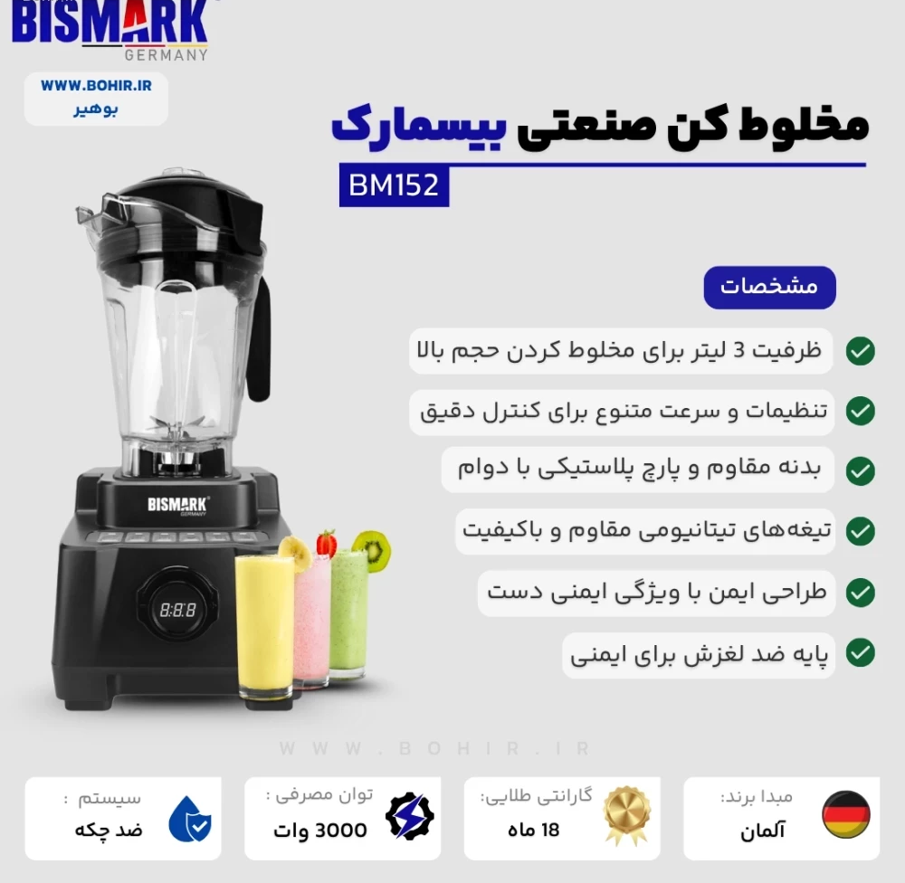 توان مصرفی ، 3000 وات ، تعداد تنظیمات سرعت ، 10 تنظیم سرعت ، نوع پنل کنترل ، پنل دیجیتال ، عملکرد پالس ، دارد ، ظرفیت ، 3 لیتر ، نوع تیغه ها ، تیغه‌های تیتانیومی ، جنس تیغه ها ، تیتانیوم ، جنس پارچ مخلوط کن ، پلاستیک مقاوم ، وزن ، تقریبا 2.5 کیلوگرم ، برنامه ها ، اسموتی، آسیاب و مخلوط کردن مواد مختلف ، نمایشگر دیجیتال ، دارد ، توضیحات ، مناسب برای استفاده صنعتی و حرفه‌ای، عملکرد عالی در مخلوط کردن مواد سخت